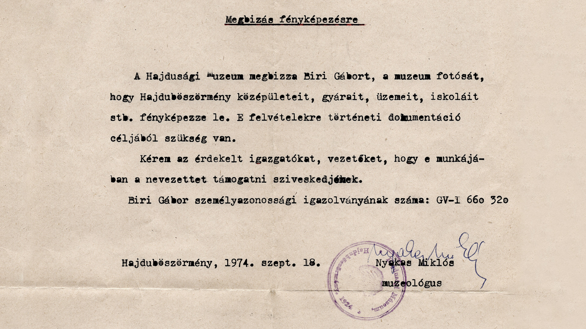 [6] Megbízás fényképezésre. A Hajdúsági Múzeum megbízza Biri Gábort, a múzeum fotósát, hogy Hajdúböszörmény középületeit, gyárait, üzemeit, iskoláit stb. fényképezze le. E felvételekre történeti dokumentáció céljából szükség van. Kérem az érdekelt igazgatókat, vezetőket, hogy e munkájában a nevezettet támogatni szíveskedjenek. Hajdúböszörmény, 1974. szeptember 18.
